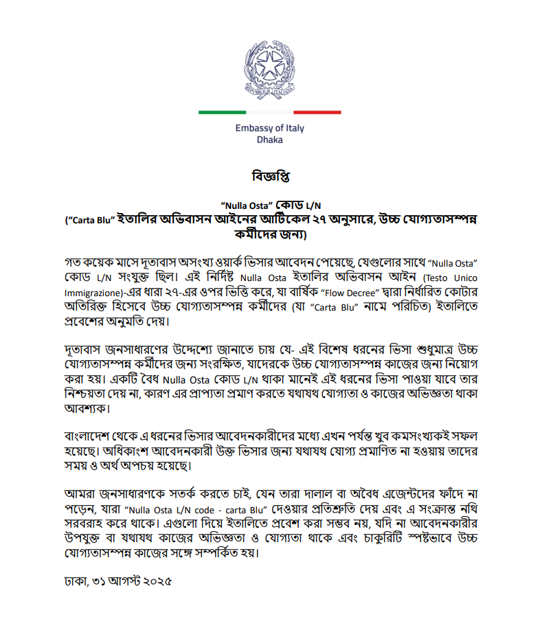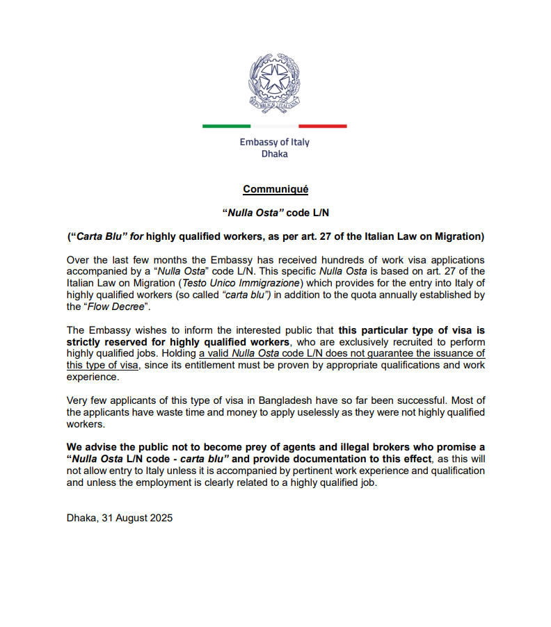 Communiqué on Nulla Osta code L/N “Blue Card”.