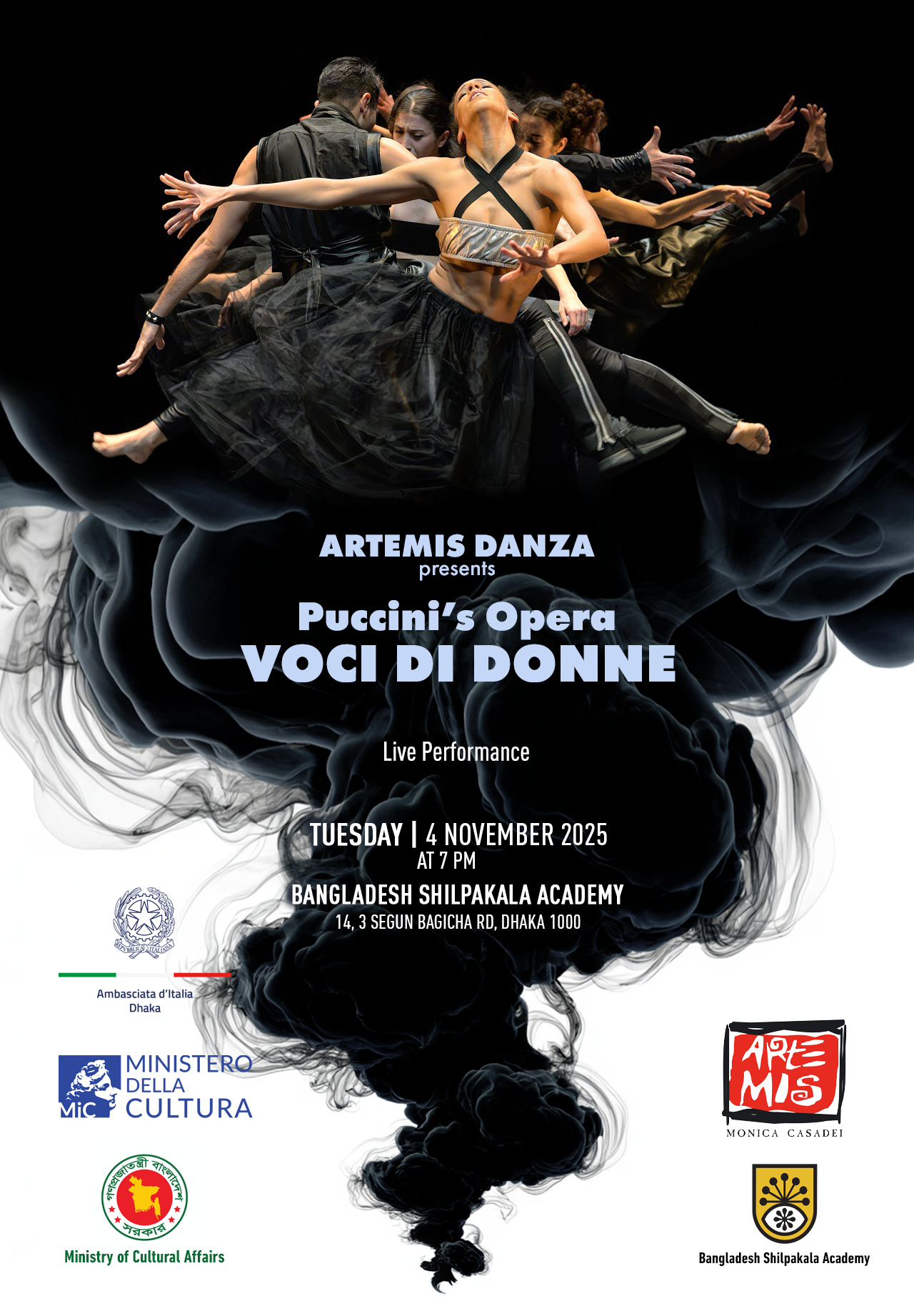 Contemporary dance met the tradition of Italian Opera yesterday at the National Theatre of the Shilpakala Academy in Dhaka, with an extraordinary performance by the Italian company Artemis Danza, directed by Monica Casadei. At the heart of the event was an exploration and celebration of the female figures in the operas of Puccini and Verdi, highlighting their strength, vitality, and sensuality.